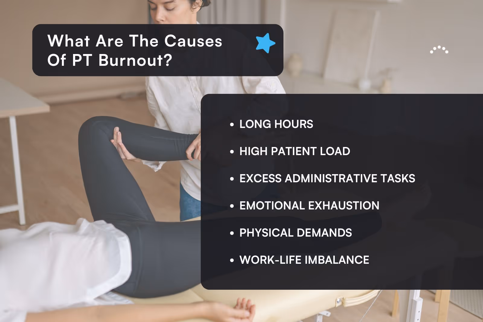 Physical therapy burnout is a growing issue that’s influenced by a wide range of factors providers face, including key professional and personal challenges such as long working hours, high patient volumes, excessive clinical documentation, emotional exhaustion, constant manual labor, and poor work-life balance.