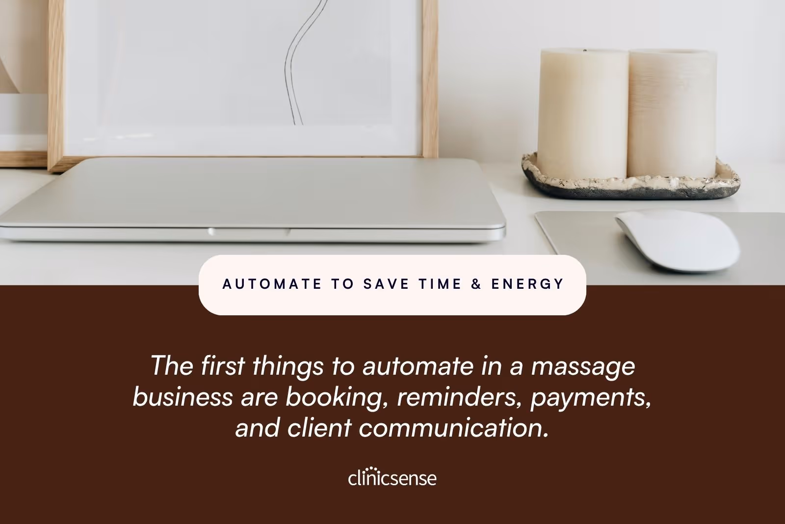 The first things to automate in a massage business are booking, reminders, payments, and client communication.